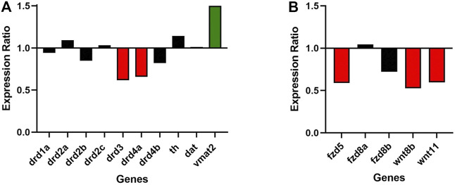 Gjd2b/Cx35.1 regulates Wnt and dopamine receptor gene expression. A qRT-PCR analysis of selected zebrafish dopamine (A) pathway genes showed the differential regulation of the D2 family receptors drd3 and drd4a, and vmat2 (N = 3). (B) Shows the downregulation of Wnt/frizzled pathway genes fdz5, wnt8b, and wnt11 (N = 4).