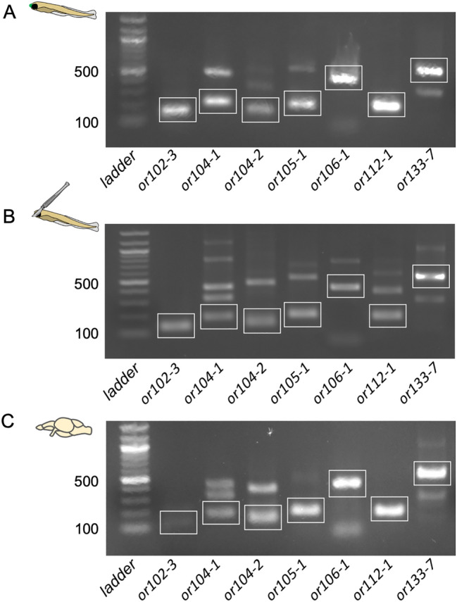 RT-PCR amplification of 7 olfactory receptor gene transcripts in non-olfactory tissues in larval and adult zebrafish. (A) or102-3, or104-1, or104-2, or105-1, or106-1, or112-1 and or133-7 genes are expressed in the whole 6-day-old zebrafish larvae. (B) All 7 OR gene transcripts are amplified in larvae without nose. 6-day-old Tg(OMP: YFP) larvae were used to ascertain the complete removal of the olfactory epithelium. (C) All tested OR gene transcripts are detected in the adult zebrafish brain. 100 bp ladder is used. Cartoons on left depict conditions for tissues used for RT-PCR. Green dot on rostral part of larva (A) represents OMP:YFP expressing olfactory epithelium, which was removed for (B). White boxes outline bands that correspond to the expected size. Original non-cropped images are in Fig. S3.