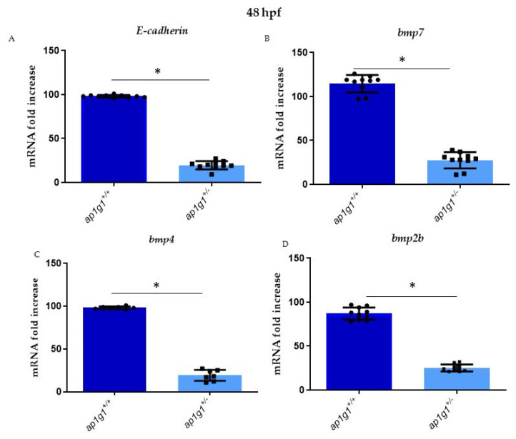 (A–D) Alterations of E-cadherin expression and different BMP factors in heterozygous and wild-type embryos, respectively: E-cadherin, bmp7, bmp4 and bmp2b. qPCR experiments were performed at 48 hpf in triplicate on cDNA samples derived from n = 30 whole embryos per condition to measure the mRNA level of E-cadherin and BMPs factor in ap1g1+/+ and ap1g1+/−. Gene expression was normalized using rpl13a as a reference gene and expressed as the mRNA fold increased. Data are representative of three replicates and are shown as the mean ± standard deviation; * p < 0.01 Student’s t-test, Statistical analysis was performed with GraphPad Version 8.3.3 GraphPad Software, Inc., Version La Jolla, CA, USA.
