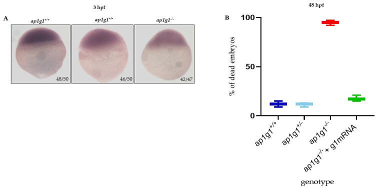 Characterization of ap1g1 mutant embryos. (A) Whole mount in situ hybridization (WISH) for dspb performed in embryos at 3.5 hpf. The experiment was done three times with n = 25 embryos at each experiment. Ratios at the bottom-right part of each picture specify the number of embryos showing the same staining pattern, compared to the total number of embryos used for each experiment. The images were taken in dorsal position at 32× magnification with a Zeiss Axiozoom V13 (Zeiss, Jena, Germany) microscope, equipped with a PlanNeoFluar Z1×/0.25 FWD 56 mm lens and Zen Pro software. (B) The graph in the panel shows, at 48 hpf, the percentage of dead embryos of the three different genotypes and the percentage of dead embryos after the microinjection with zebrafish wild type γ1 mRNA. The experiment was repeated three times.