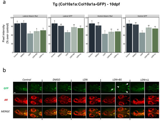 Figure 6. BMP inhibitor exposure followed by two probiotics treatments in Tg(col10a1a:col10a1a-GFP) larvae. (a) Integrated pixel intensity values for various areas measured in 10 dpf zebrafish Tg(col10a1a:col10a1a-GFP) larvae divided into various groups—control, DMSO, LDN, LDN+BS and LDN+LL—and stained with AR. DMSO was used as additional control since it was employed as the solvent for LDN. One-way ANOVA and Tukey’s multiple comparison tests were used, and statistical significance was set at p < 0.05. Different letters denote statistically significant differences among the experimental groups. (b) GFP, AR staining and merged images of the head area (lateral and ventral views) of Tg(col10a1a:col10a1a-GFP) larvae of the different treated groups. White arrows denote GFP in various bony structures and the white arrowhead indicates the presence of a signal in additional structures (that was absent in other groups) in BS-treated fish after LDN exposure (LDN + BS).