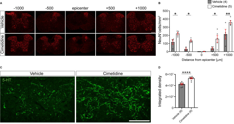 Cimetidine treatment leads to higher density of neurons and greater serotonergic innervation after spinal cord injury in mice. A: Single plane confocal images of spinal cord cross-sections 28 days after spinal cord contusion injury stained with anti-NeuN antibody to label neurons. Note the greater sparing of neurons in the Cimetidine-treated animal compared to the vehicle group. B: Quantification of NeuN labeling in the ventral horn is shown. Mice treated with Cimetidine showed increased survival of NeuN+ neurons in the ventral horn of the spinal cord as compared to controls on either side of the lesion center (Two-way RM-ANOVA; group effect F(1,7) = 20.65, p = 0.0027; with post-hoc Bonferroni multiple comparison test; p*(-1000µm) = 0.0448, p*(-500µm) = 0.0496, p*(+500µm) = 0.0172, p**(+1000µm) = 0.0024, n = 4-5 mice per group.) C: Increased serotonergic innervation of the ventral horn treated with Cimetidine is observed at 1mm caudal to the lesion center by 5-HT immunohistochemistry. D: Quantification by optical density measurements shows that there is significantly greater 5-HT innervation in Cimetidine treated mice than in vehicle-treated controls. Mann-Whitney unpaired t test, p ≤ 0.0001, n = 9 per group; Scale bar = 200 µm and 100 µm for A and C, respectively.