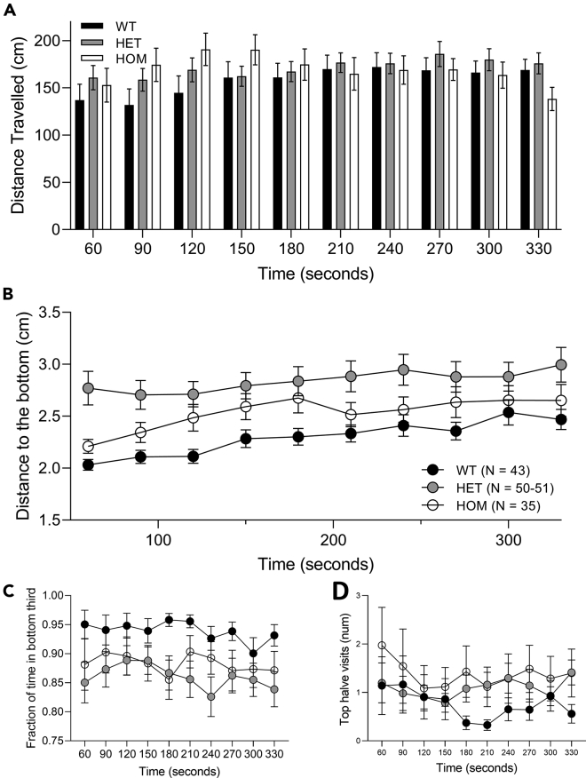 (C) Fraction of time in the bottom third and D) top half visits for the three genotypes during the novel tank diving assay. Graphs show mean ± SEM. Intragroup variations in N number are due to statistical exclusion criteria applied at each time bin.