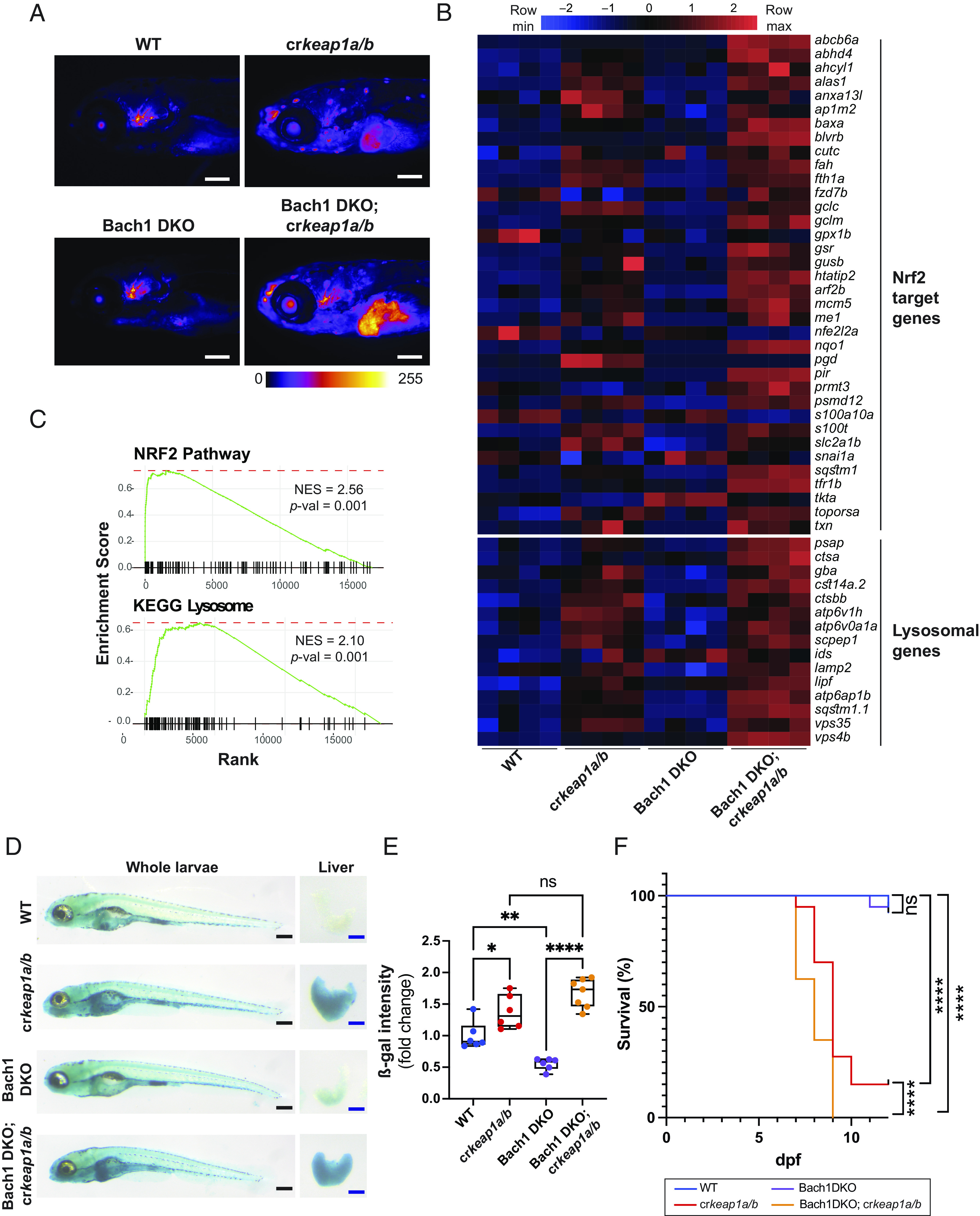 Bach1-mediated repression of Nrf2 modulates lysosomal biogenesis. (A) Representative whole-mount fluorescent images of WT, crkeap1a/b, Bach1 DKO, and Bach1 DKO; crkeap1a/b zebrafish on a gstp1:EGFP background at 7 dpf. Fluorescent images are pseudocolored using the Fire LUT. Scale bars represent 200 µm. (B) Heatmap of Nrf2 target genes and lysosomal genes in WT, crkeap1a/b, Bach1 DKO, and Bach1 DKO; crkeap1a/b zebrafish at 7 dpf as determined by RNA-Seq analysis, n = 4 pools of 10 larvae. (C) GSEA plots derived from RNA-Seq analysis of Bach1 DKO; crkeap1a/b versus Bach1 DKO zebrafish at 7 dpf demonstrating the Nrf2 pathway signature and KEGG lysosomal signature. (D) Representative images of ß-gal-stained whole-mount (Left) and dissected larval livers (Right) from WT, crkeap1a/b, Bach1 DKO, and Bach1 DKO; crkeap1a/b zebrafish at 7 dpf. Black scale bars represent 350 µm, blue scale bars represent 100 µm. (E) Quantification of ß-gal intensity in dissected larval livers represented in D. Data are shown as mean and interquartile range, n = 6 to 7. (F) Kaplan–Meier survival plot of WT, crkeap1a/b, Bach1 DKO, and Bach1 DKO; crkeap1a/b zebrafish, n = 40. For all experiments, *P < 0.05, **P < 0.01, ****P < 0.0001.