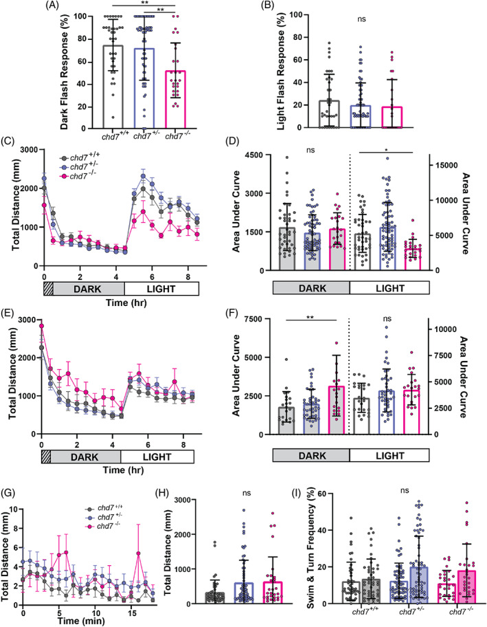 Hypo‐ and hyper‐activity phenotypes in chromodomain and ATP‐helicase domain mutants. (A) Chromodomain larval dark‐flash and (B) light‐flash response frequencies (chd7 +/+ n = 37, chd7 ncu101/+ n = 69, chd7 ncu101/ncu101 n = 26) (mean ± SD, Ordinary one‐way ANOVA with Tukey's multiple comparison, **p < 0.01). (C) Chromodomain larval average total distance traveled plot during 9 h of recording, analyzed every 30 min, including 1 h of acclimation in the dark, 4 h in the dark, and 4 h in light (chd7 +/+ n = 44, chd7 ncu101/+ n = 70, chd7 ncu101/ncu101 n = 26) (mean ± SEM). (D) Chromodomain larval area under the curve for individual distance plots during the dark or light phase (mean ± SD, Ordinary one‐way ANOVA with Dunnett's multiple comparisons, *p < 0.05). (E) ATP‐helicase domain larval average total distance traveled (chd7 +/+ n = 22, chd7 rdu1002/+ n = 42, chd7 rdu1002/rdu1002 n = 20) (mean ± SEM) and (F) area under the curve during the dark or light phase (mean ± SEM (G) chromodomain larval total distance time plot during 18.5 min of recording (chd7 +/+ n = 46, chd7 ncu101/+ n = 67, chd7 ncu101/ncu101 n = 29) (mean ± SEM). (H) Sum of total distance traveled for individual larvae, (I) swim (open bars) and turn (shaded bars) frequencies (mean ± SD, Kruskal‐Wallis with Dunn's multiple comparisons).