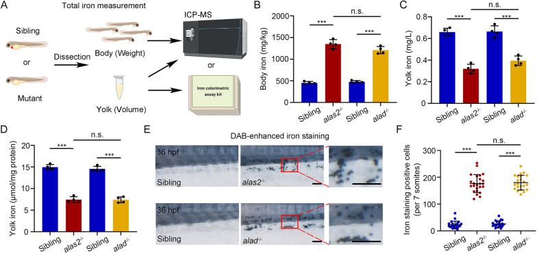 Heme-deficient primitive RBCs display iron accumulation. (A) Workflow of iron distribution assay of body and corresponding yolk regions by ICP-MS or iron colorimetric assay kit, respectively, in alas2−/−, alad−/− and their siblings at 36 hpf. (B-D) Quantification of the total iron level of dissected body (B) and yolk (C,D). The body and yolk sac iron content are quantified as weight (mg/kg) and volume (mg/l or μmol/mg protein), respectively. n=4 experimental replicates. (E) Representative bright-field images of DAB-enhanced iron staining in alas2−/−, alad−/− and their siblings at 36 hpf. Right column shows magnification of areas in red box showing iron enriched RBCs in caudal hematopoietic tissue (CHT) circulation. (F) Quantification of the iron staining-positive RBCs in E. n=3 experimental replicates. Number of samples are indicated. Data are mean±s.d. ***P<0.001 (one-way ANOVA, Tukey's multiple comparisons). n.s., not significant. Scale bars: 100 μm.