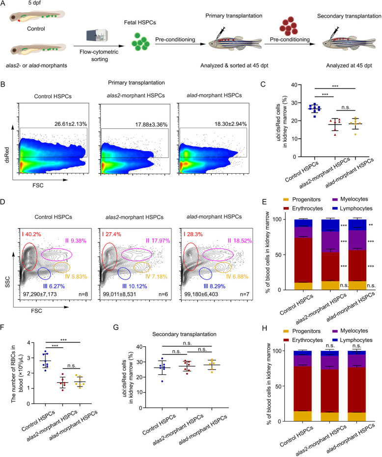 HSPCs derived from alas2- and alad-deficient embryos show low erythroid lineage reconstitution efficiency. (A) Schematic workflow for the primary and secondary HSPC transplantation with sorted ubi:dsRed+/CD41:GFPlow HSPCs in alas2 and alad morphants at 5 dpf. (B) Flow cytometric analysis of engrafted ubi-dsRed+ cells in the recipient kidney marrow (KM) at 45 dpt. Number of recipients: n (control HSPCs>irradiated WT)=8, n (alas2-morphant HSPCs>irradiated WT)=6, n (alad-morphant HSPCs>irradiated WT)=7. (C) Statistical analysis of the engraftment efficiency in B; the total numbers of recipients are indicated. (D) Flow cytometric analysis of different blood cell types in recipient kidney marrows. Each circle and percentile represent different cell lineages (I, erythrocytes; II, myelocytes; III, lymphocytes; IV, progenitors). (E) Quantification of different blood lineages in the kidney marrows based on D. Total cell numbers in whole kidney marrows are indicated. (F) Statistical analysis of the number of RBCs in recipient peripheral blood. The total numbers of recipients are indicated. (G) Statistical analysis of the engraftment efficiency of control, alas2 and alad morphants after secondary transplantation. Number of recipients: n (control HSPCs>irradiated WT)=7, n (alas2-morphant HSPCs>irradiated WT)=7, n (alad-morphant HSPCs>irradiated WT)=5. Total numbers of recipients are indicated. (H) Quantification of different blood lineages in the kidney marrows based on G. Total numbers of recipients are indicated. Number of samples are indicated. Data are mean±s.d. **P<0.01, ***P<0.001 [one-way ANOVA, Tukey's multiple comparisons (C,F,G); two-way ANOVA, Sidak's multiple comparisons (E,H)]. n.s., not significant.