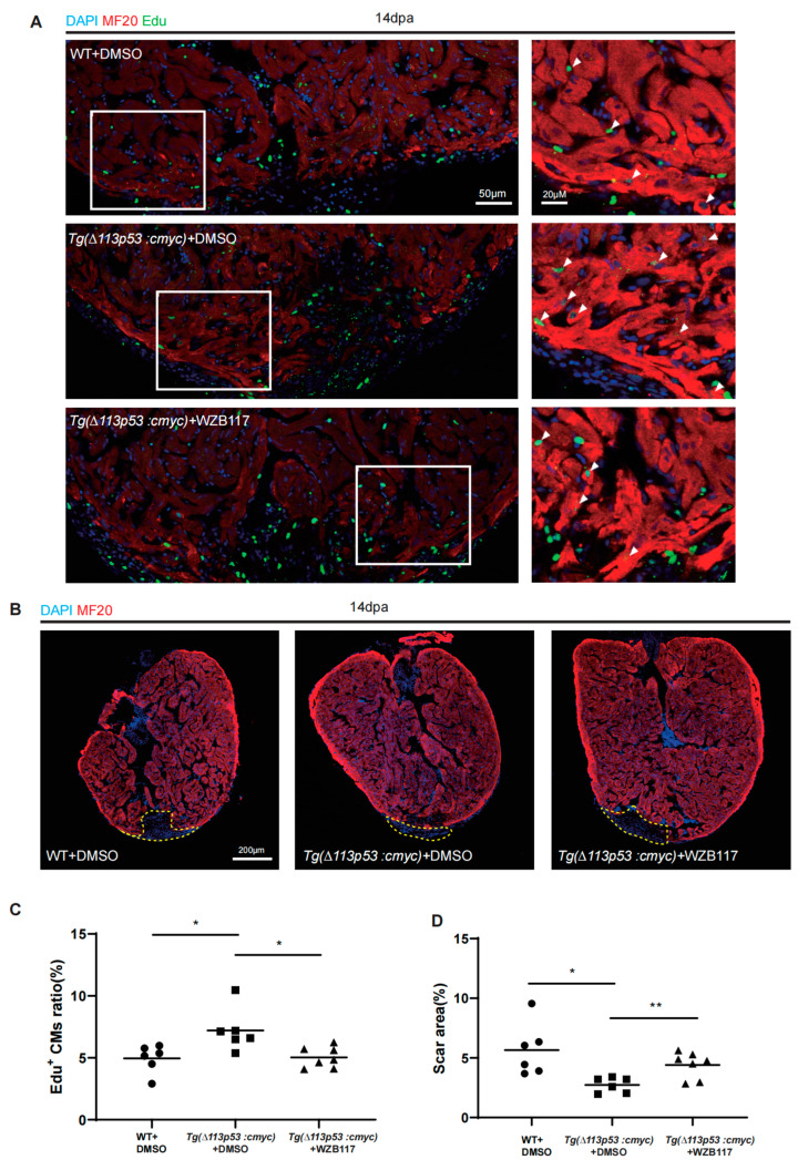 Conditional overexpression of cmyc in ∆113p53+ cells promotes heart regeneration dependent on Glut1. (A) Immunostaining of MF20 (in red) and EDU incorporation assay (in green) of injury hearts at 14 dpa in WT and Tg(∆113p53:cmyc) zebrafish intraperitoneally injected with DMSO (the injection control) or WZB117. The nuclei were stained with DAPI (in blue). Framed areas were magnified in right panels. Scale bar: 50 μm or 20 μm as indicated. (B) Immunostaining of MF20 (in red) of injury hearts at 14 dpa in WT and Tg(∆113p53:cmyc) zebrafish intraperitoneally injected with DMSO (the injection control) or WZB117. The nuclei were stained with DAPI (in blue). Scale bar: 200 μm. (C) Statistical analyses of EDU+ CMs in (A). The EDU+ CMs were presented as the percentage of the total MF20+ cells at the injury sites. Each dot represents an individual heart (round dot, WT with DMSO injection group; frame dot, Tg(∆113p53:cmyc) with DMSO injection group; triangle dot, Tg(∆113p53:cmyc) with WZB117 injection group). n: 6–7 hearts/sample. The experiment was repeated two times. (D) Statistical analyses of scar areas in (B). Average injury area without MF20 signals on heart sections was presented as the percentage of the total ventricular area. Each dot represents an individual heart (round dot, WT with DMSO injection group; frame dot, Tg(∆113p53:cmyc) with DMSO injection group; triangle dot, Tg(∆113p53:cmyc) with WZB117 injection group). n: 6–7 hearts/sample. The experiment was repeated two times. Statistical analysis was performed by Student’s two-tailed unpaired t test in GraphPad Prism 8. The p values were represented by n.s. and asterisks. *, p < 0.05; **, p < 0.01.