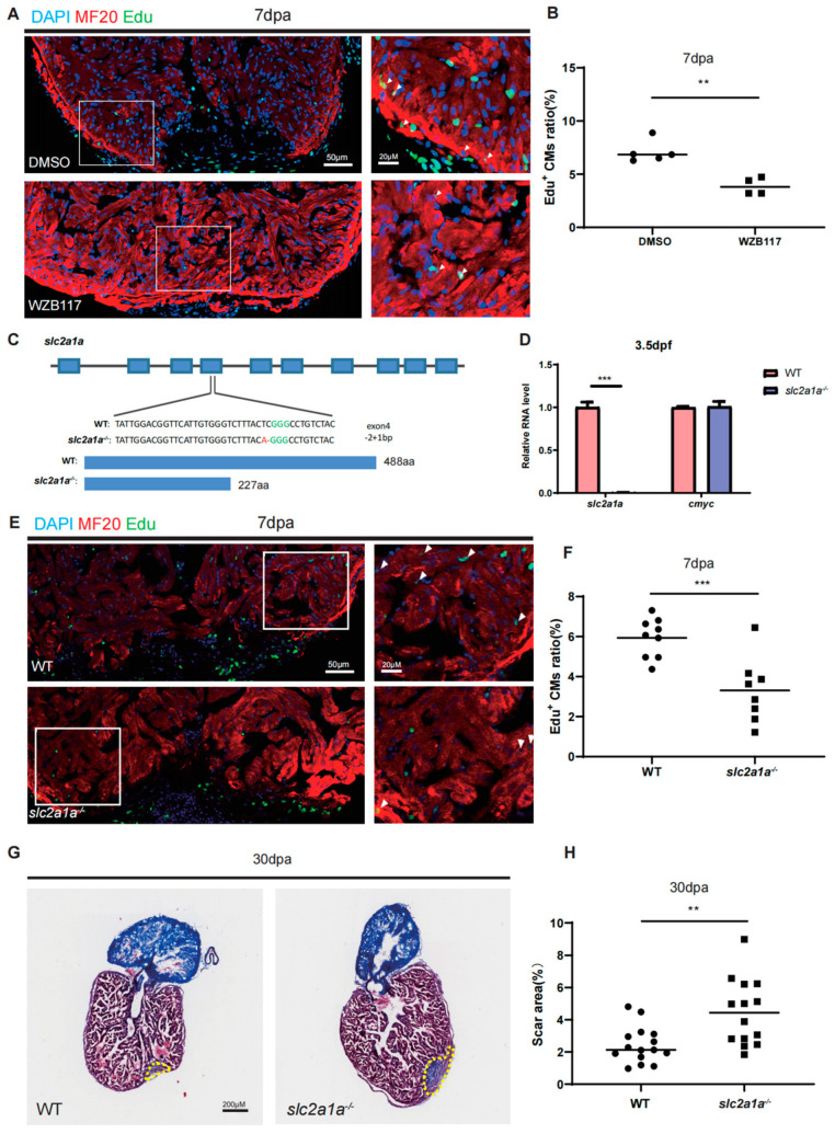 Depletion of Glut1 impairs zebrafish heart regeneration. (A) Cryosections of Edu-labelled (in green) zebrafish injury hearts with different treatments at 7 dpa were immunostained by anti-MF20 (in red). The nuclei were stained with DAPI (in blue). The zebrafish with heart resections were intraperitoneally injected with DMSO (the injection control) or WZB117. Framed areas were magnified in the right panels. Scale bar: 50 μm or 20 μm as indicated. (B) Statistical analyses of EDU+ CMs in A. The EDU+ CMs were presented as the percentage of the total MF20+ cells at the injury sites. Each dot represents an individual heart (round dot, DMSO injection group; frame dot, WZB117 injection group). n: 4–5 hearts/sample. The experiment was repeated three times. (C) Diagram showing the gRNA targeting site and two-bp deletion and one-bp insertion in the exon 4 of the slc2a1a mutant, which results in a premature stop codon (PTC) at 227 aa (the GGG in green is the PAM sequence). (D) qRT-PCR was performed to examine the expression of slc2a1a and cmyc in WT and slc2a1a−/− mutant embryos at 3.5 dpf. (E) Immunostaining of MF20 (in red) and EDU incorporation assay (in green) of WT and slc2a1a−/− injury hearts at 7 dpa. Framed areas were magnified in the right panels. Scale bar: 50 μm or 20 μm as indicated. (F) Statistical analyses of EDU+ CMs in C. The EDU+ CMs were presented as the percentage of the total MF20+ cells at the injury sites. Each dot represents an individual heart (round dot, WT group; frame dot, slc2a1a−/− group). n: 8–9 hearts/sample. The experiment was repeated two times. (G) Fibrin clot stained with Masson’s trichrome on the cryosections of WT and slc2a1a−/− injury hearts at 30 dpa. Yellow dotted lines indicate the approximate injury area. Scale bar: 200 μm. (H) Statistical analyses of scar areas in (E). Average injury area with fibrin clots on heart sections was presented as the percentage of the total ventricular area. Each dot represents an individual heart (round dot, WT group; frame dot, slc2a1a−/− group). n: 14–15 hearts/sample. Statistical analysis was performed by Student’s two-tailed unpaired t test in GraphPad Prism 8. The p values were represented by n.s. and asterisks. **, p < 0.01; ***, p < 0.001.