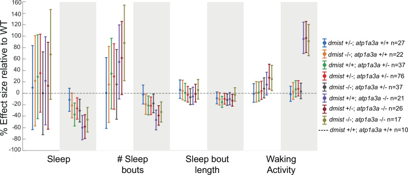 Figure 6 dmist mutants have altered sodium homeostasis. (A) Brain sodium levels are significantly elevated after exposure to pentylenetetrazol (PTZ) in both atp1a3aΔ19/Δ19 (two independent experiments) and dmisti8/i8 (four independent experiments) fish relative to wild type and heterozygous mutant siblings, as measured by fluorescence intensity of Sodium Green, normalised to the sample mean intensity. Crosses show mean ± SEM. n indicates the number of animals. Below are example images of brains stained with Sodium Green. *p<0.05, **p<0.01, one-way ANOVA, Tukey’s post hoc test. (B) Under baseline conditions, brain sodium levels are significantly elevated in dmisti8/i8 fish at night but not during the day, as measured by fluorescence intensity with Sodium Green. Crosses show mean ± SEM. *p<0.05, **p<0.01, one-way ANOVA, Tukey’s post hoc test. (C) dmisti8/i8 larvae have increased rebound sleep compared to wild-type siblings following exposure to 5 mM PTZ. Representative sleep traces of dmist+/+ (no drug, water vehicle controls in black; PTZ exposed in blue) and dmisti8/i8 (no drug in purple; PTZ exposed in red) following 1 hr exposure to 5 mM PTZ (black bar) in the morning. Data are mean ± SEM. dmisti8/+ animals are not plotted for clarity but are included in panel (D). (D) Rebound sleep after exposure to 5 mM PTZ, calculated from the experiment in (C). Each dot represents a single fish, grey lines show mean ± SEM. (E) Effect size of change in sleep after 1 hr treatment with 5 mM PTZ (and washout) compared to vehicle-treated controls (error bars show 95% confidence intervals). *p<0.05, one-way ANOVA, Tukey’s post hoc test. (F) Effect sizes (and 95% confidence interval) relative to wild types (dotted line) on sleep at night in larvae from dmist+/-; atp1a3a+/- in-crosses from three independent experiments. p-Values are assigned by an F-test on the fixed effects coefficients from the linear mixed effects model relative to dmist+/+; atp1a3a+/+ animals. For all sleep-wake parameters, see Figure 6—figure supplement 1. *p<0.05, **p<0.01, ***p<0.0001, ns p>0.05..