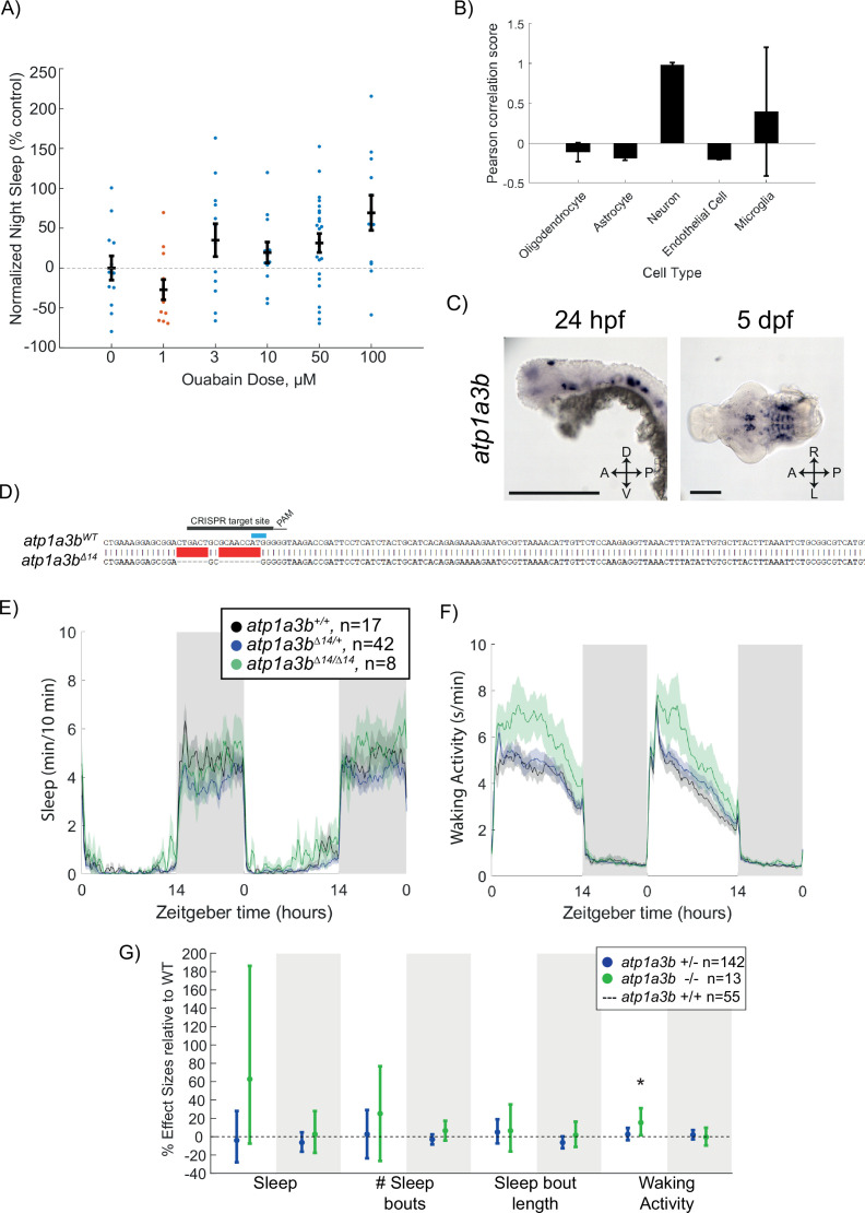 (A) Dose–response curve of ouabain’s effects on sleep at night, shown as mean ± SEM and normalised to the DMSO control. Each data point represents a single fish. (B) Pearson rank correlation of canonical cell-type markers with Atp1a3a_Mm shows high co-expression with neuronal markers compared to astroglial and endothelial cell markers. Data are mean ± SEM. (C) In situ hybridisation of atp1a3a at 24 hpf (whole animal) and 5 dpf brain (ventral view). Anterior is to the left. Scale bar = 0.5 mm (24 hpf); 0.1 mm (5 dpf). (D) CRISPR-Cas9 targeting of atp1a3b resulted in a 14 bp deletion that eliminates the start codon (blue). Guide RNA target sequence and PAM sequence are shown as black bars. The sequence that is deleted in the mutant is indicated with a red bar. (E, F) Representative single behavioural experiment showing atp1a3bΔ14/Δ14 mutants have increased daytime waking activity but normal sleep patterns. (G) Data from two independent experiments combined with a linear mixed effects model. Plotted are the genotype effect sizes (95% confidence interval) for each parameter relative to wild type (dotted line) for each genotype. Shading indicates day (white) and night (grey). n indicates the number of animals. p-Values are assigned by an F-test on the fixed effects coefficients from the linear mixed effects model relative to atp1a3b+/+ animals. *p<0.05.