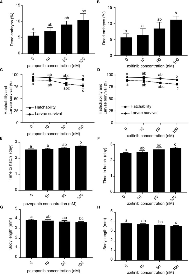 Developmental toxicities and survival of zebrafish embryos following exposure to different concentrations (0, 10, 50, 100 nM) of pazopanib and axitinib for 96 (h)
