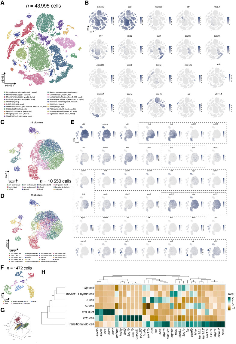 (A) t-distributed stochastic neighbor embedding (t-SNE) plot showing the cell type assignment of all single cells (~40,000). The classifications were based on previously known marker genes that were significantly enriched in each cluster (highlighted in parentheses). TH2, T helper 2 cells; ILC2, innate lymphoid cells type 2. (B) t-SNE plots of well annotated cell markers, colored by the normalized gene expression levels. (C and D) UMAP plot of subclustering including pancreatic duct, krt5+ cells, and endocrine cells (~10,000). (E) UMAP plots of various marker genes, colored by the normalized gene expression levels. (F and G) UMAP plot and 3D PCA plot showing the embedding of krt5+ cell and all endocrine cells. (H) Heatmap highlighting the key lineage-committed transcription factors and hormones in each cluster, with colors displayed on column-scaled mean expression. The rows and clusters were ordered by hierarchical clustering of scaled expression values.