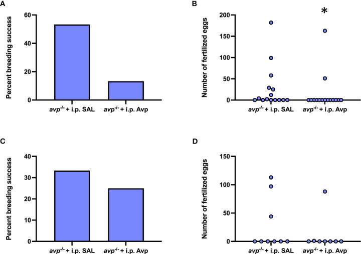 Rescue experiments assessing reproductive success in female avp-/- fish following single 1x acute (A, B) or 3x repeated i.p. injections (every 3 d) (C, D) of physiological saline or 1 μg/g vasotocin prior to breeding assays with WT males. For the 1x acute injection experiment, n=15 avp-/- females were injected with physiological saline, and n=15 with 1 μg/g vasotocin prior to breeding assays with WT males. For the 3x repeated injection experiment, n=9 avp -/- females were injected with physiological saline, and n=8 avp -/- females were injected with 1 μg/g vasotocin prior to breeding assays with WT males. (A, C) Percentage of successful breeding pairs. (B, D) Median number of fertilized eggs of avp-/- fish used in breeding assays following i.p. injection of physiological saline or 1 μg/g 1 μg/g vasotocin. Data were analyzed by Fisher’s exact test and Mann-Whitney U test, respectively, and significant differences at P<0.05 are indicated by asterisk.