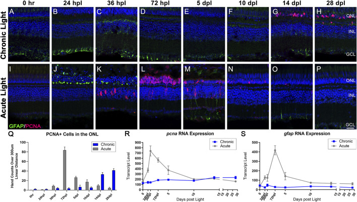 Distinct responses in Müller glia gliosis and proliferation in the CLL and AL models. Müller glia (MG) intermediate filaments were immunolabelled with anti-GFAP antisera (GFAP; green) and cell cycle re-entry was demonstrated with anti-PCNA antisera (PCNA; red). Nuclei were stained with TO-PRO-3 (blue).