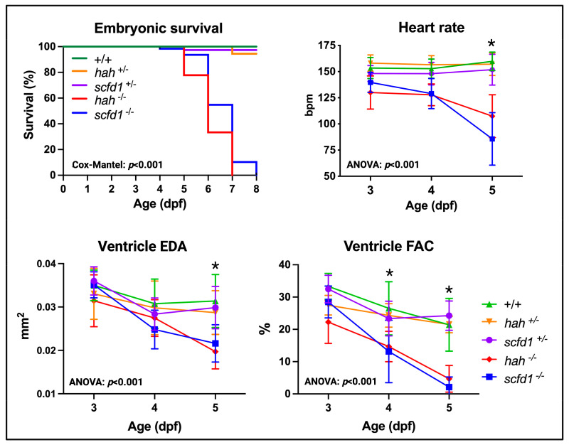 Scfd1 deficiency leads to cardiac dysfunction in zebrafish embryos. Survival, heart rate, ventricular end-diastolic area (EDA) and fractional area change (FAC) are reduced in embryonic