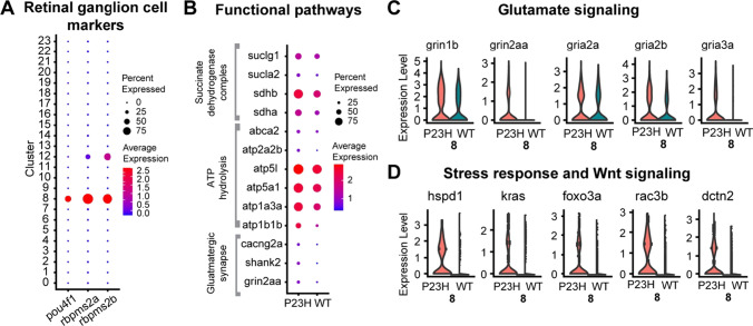Comparative transcriptomic analysis of retinal ganglion cells in WT-P23H integrated dataset. A Dot plot showing the specific enrichment of canonical markers pou4f1, rbpms2a and rbpms2b in the RGC cluster compared to all other retinal cell types. rbpms2a and rbpms2b are present at lower levels in Müller glial cells (12) as well. B Dot plot showing the expression level and the percentage of cells expressing DEGs involved in different functional pathways between WT and P23H. C, D Violin plots showing increased levels of expression of DEGs involved in glutamate signaling (C), stress response and Wnt signaling (D) between WT and P23H RGCs