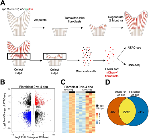 Fig. 4 Chromatin accessibility profiling of fibroblasts purified from regenerating fins. (A) Overview of genetic labelling, sample collection and isolation of 0 dpa and 4 dpa fin fibroblasts for transcriptional and chromatin accessibility profiling from tph1b:CreER; ubi:switch fish. Uninjured samples were collected from ∼1.5 mm fin slits, while regenerating samples were collected at 4 dpa from the regenerating tissue and one joint proximal to the amputation plane. Each sample contained 75 pooled fin clips, dissociated and sorted for 100 K mCherry+ cells. (B) Dot plot of differential ATAC-seq chromatin regions linked to nearby differential transcripts in 4 dpa versus 0 dpa fibroblast samples. Each point indicates a separate ATAC-seq peak. (C) Heat map of increased transcripts in 4 dpa versus 0 dpa regenerating fibroblast tissue linked to nearby differentially accessible chromatin regions. (D) Venn diagram of differential transcriptomic data, indicating overlap between 0 versus 4 dpa differential fibroblast transcriptomes and differential 0 versus 4 dpa whole-fin transcriptomes.