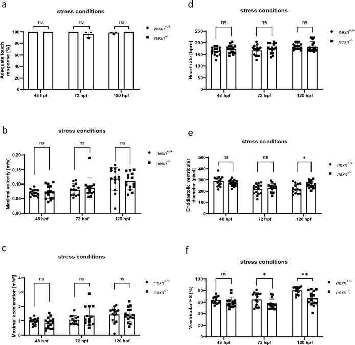 Increased muscular workload does not lead to aggravated cardiac dysfunction in nexn knockout zebrafish. (a) nexn+/+ and nexn−/− embryos do not show significant differences regarding responsiveness to mechanical stimuli at 48, 72 or 120 hpf (N = 3, mean ± SD, p > 0.9999 for all using Mann–Whitney test). (b) Maximal velocity was not affected at any developmental stage after increasing workload (N = 3, n = 15, mean ± SD, 48 hpf: p = 0.7875, 72 hpf: p = 0.5428, 120 hpf: p = 0.5202 using two-tailed t-test). (c) Maximal acceleration is at a similar level in nexn+/+ and nexn−/− embryos at 48, 72 and 120 hpf (N = 3, n = 15, mean ± SD, 48 hpf: p = 0.2460, 72 hpf: p = 0.1754, 120 hpf: p = 0.9284 using two-tailed t-test). (d) Heart rate of nexn−/− embryos was at a similar level as in nexn+/+ embryos at 48, 72 and 120 hpf (N = 3, n = 15, mean ± SD, 48 hpf: p = 0.1738, 72 hpf: p = 0.3121, 120 hpf: p = 0.8520 using two-tailed t-test). (e) Increased workload does not affect enddiastolic ventricular diameter at 48 and 72 hpf (N = 3, n = 15, mean ± SD, 48 hpf: p = 0.1807, 72 hpf: p = 0.4152 using two-tailed t-test) but leads to increased enddiastolic diameter at 120 hpf (N = 3, n = 15, mean ± SD, p = 0.0017 using two-tailed t-test). (f) Analysis of ventricular fractional shortening does not show altered heart contractility in nexn−/− compared to nexn+/+ embryos at 48 hpf (N = 3, n = 15, mean ± SD, p = 0.1538 using two-tailed t-test) but reduced fractional shortening at 72 and 120 hpf (N = 3, n = 15, mean ± SD, 72 hpf: p = 0.0379, 120 hpf: p = 0.0020 using two-tailed t-test). FS fractional shortening, ns not significant, *p < 0.05, **p < 0.01. Exact values (mean ± SD) are shown in Supplementary Table 1.