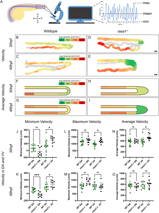 Fig. 2 Blood flow velocity is affected by the vascular malformations in rasa1−/− embryos. (A) Diagram illustrating the areas where movies were captured and velocity metric calculation. (B-E) Velocity heatmaps of representative wild-type and rasa1 mutant embryos. (F-I) Mean velocity heatmaps of wild-type and rasa1 mutant embryos. (J-O) Quantification of minimum, maximum and mean velocities in wild types and rasa1 mutants at 30 hpf and 48 hpf (wild type 30 hpf and 48 hpf, n=11; rasa1−/− 30 hpf and 48 hpf, n=9). (J,K) Minimum velocity at 30 hpf and 48 hpf of wild type and rasa1 mutants in the DA and ventral vein (VV). (L,M) Maximum velocity at 30 hpf and 48 hpf of wild type and rasa1 mutants in the DA and VV. (N,O) Mean velocity at 30 hpf and 48 hpf of wild type and rasa1 mutants in the DA and VV. Statistical analysis was carried out using one-way ANOVA with Sidak's correction. Data are mean±s.d. Scale bars: 20 µm.