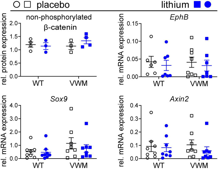 Lithium does not increase the expression and activity of non-phosphorylated β-catenin. WT (circles) and 2b4he2b5ho mutant (VWM; squares) mice (n = 8 per treatment, per genotype) were i.p. injected daily with placebo (black) or 200 mg/kg lithium (blue) for 1 week. Mice were terminated approximately 8 h after the final injection. Cerebellar RNA and protein samples were derived from the same lysate. Levels of non-phosphorylated β-catenin were determined using the Western blot (n = 3–4). Lithium treatment effects on indicated β-catenin-regulated markers were determined with qPCR (n = 6–8) (Sorcs1 and Nrxn as reference). Lithium differences were analyzed with two-way ANOVAs (Supplementary Data Sheet S1). The graphs show individual and mean values, +/− SEM. Raw data are available in Supplementary Data Sheet S2.