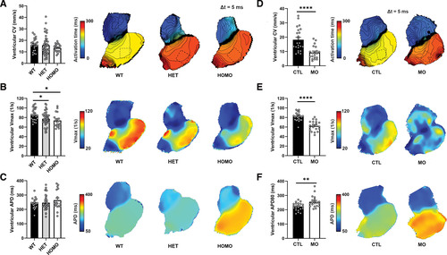 Fig. 1 mapre2 loss of function leads to decreased ventricular conduction and voltage-gated sodium channel (NaV) function. A through C, Voltage mapping of hearts isolated from wild-type (WT) vs heterozygous (HET) and homozygous (HOMO) mapre2 knockout (KO) zebrafish. In HOMO hearts, there was a nonsignificant decrease in ventricular conduction velocity (CV; A), a significant decrease in ventricular maximum upstroke velocity of the action potential (Vmax; dV/dt; P=0.0121 vs WT; B), and a nonsignificant increase in ventricular action potential duration (APD; C). There was also a significant decrease in ventricular Vmax in HET hearts compared with WT (P=0.0363). Multiple comparisons were done using the Dunnett test if 1-way ANOVA was significant (P=0.0147 for Vmax in B). D through F, Voltage mapping of hearts isolated from control (CTL) vs mapre2 morpholino (MO)-injected larvae. In MO hearts, there was a significant decrease in ventricular CV (unpaired t test, P<0.0001; D) and Vmax (unpaired t test, P<0.0001; E) and a significant increase in ventricular APD (Mann-Whitney U test, P=0.0021; F). All hearts (represented by dots) were isolated from 5-dpf zebrafish larvae. The dotted squares in A and D reflect the main ventricular area in the hearts from which the parameters were measured. APD was measured at 80% repolarization while the hearts were paced at 100 bpm.