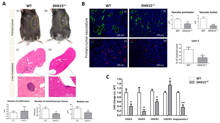 Tumor growth and metastases in Dhx15+/− mice following Hepa1-6 tumor induction. (A) In the upper panels, macroscopic images of tumor size in wild-type (panel a) and Dhx15+/− mice (panel b) 5 weeks after mouse Hepa1-6 hepatoma cells implantation. Yellow circles delimitate primary tumor localization. On the lower panels, representative liver sections with metastatic areas after haematoxylin–eosin staining (H&E) in wild-type (panel c) and Dhx15+/− mice (panel d). Original magnification: ×10. The lower images of each condition correspond to the enclosed area of the upper images that were taken at higher magnifications (×100 and ×200, respectively). Quantifications of tumor volume (cm3), number of metastases, and nodule size are shown in the lower graphs. Bars represent mean ± SEM, * p < 0.05 vs. wild-type mice (n = 10 animals for each condition). (B) Immunostaining of intratumoral vessels in wild-type (blood vessels stained with endomucin, panel a, and lymphatic vessels stained with Lyve-1, panel c) and Dhx15+/− (blood vessels stained with endomucin, panel b, and lymphatic vessels stained with Lyve-1, panel d) mice. Quantification of total vascular perimeter and lumen of all intratumoral blood vessels and percentage of Lyve-1-positive immunostaining are shown in the right graphs. Bars represent mean ± SEM, * p < 0.05, ** p < 0.01, *** p < 0.001 vs. wild-type mice (n = 10 animals for each condition). Original magnification: 200×. (C) RNA extraction of primary tumors from either wild-type or Dhx15+/− mice was performed. mRNA expression was analyzed by RT-qPCR. The graph shows the expression levels of Vegf-a, Vegf-d, Vegfr1, Vegfr3, and Angiopoietin 1 genes in wild-type and Dhx15+/− conditions. mRNA levels are shown as fold change relative to Hprt mRNA levels. Bars represent mean ± SEM, * p < 0.05, ** p < 0.01 vs. wild-type (n = 4).