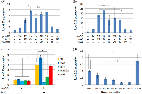 Fig. 5 Transcriptional regulation of pou5f3 by tail bud-related genes. The expression of the luciferase gene Luc-2.2, which is under regulation of the pou5f3 regulatory region, was assayed in P19 cells that had been transfected with the expression plasmids of regulatory genes. ctrl, egfp used as control. Ordinates show the expression of Luc-2.2 relative to that in the absence of effectors. Below are the amounts of transfected effector plasmids (ng/well). Total amounts of effector DNA were adjusted with pCS2+egfp. (A, B) Transcriptional regulation of pou5f3 by soxB1 genes. Luc-2.2 expression was assayed in P19 cells that had been transfected with the effector plasmids of pou5f3 and soxB1 genes by different combinations. (C) Transcriptional regulation of pou5f3 by pou5f3, sox3, and other effector genes. (D) Expression of Luc-2.2 driven by sox3 and pou5f3 in the presence of retinoic acid at different concentrations. Except for the highest concentration, RA repressed Luc-2.2 in a dose-dependent manner. All experiments were repeated at least three times, resulting in essentially the same results. The results of t test among the data marked with horizontal bars are shown. n.s., not significant; *, p < .05; **, p < .01