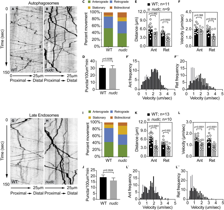 Fig. 2 Decreased retrograde transport velocity of autophagosomes and late endosomes in nudc mutants (A and B) Kymograph analysis of LC3-labeled autophagosome transport. (C) The autophagosome transport frequency in nudc mutants. Anterograde transport frequency decreases but the percent of autophagosomes moving in the retrograde direction is not changed (ANOVA; anterograde: p = 0.0045; retrograde: p = 0.7890). Stationary particle frequency increases (ANOVA; p = 0.0023). (D) Total number of autophagosomes in the axon is unchanged (ANOVA). (E and F) Quantification of autophagosome transport distance and velocity show defects for both during retrograde transport (ANOVA). (F` and F``) Histograms of binned transport velocities show a clear shift to slower velocities for retrograde transport in nudc mutants. (G and H) Kymograph analysis of Rab7-labeled late endosome transport. (I) The percent of retrograde late endosome transport decreases in nudc mutants (ANOVA; p = 0.0346), while stationary particle frequency increases (ANOVA; p = 0.0031). (J) Total number of late endosomes in the axon is unchanged (ANOVA; p = 0.3524). (K and L) Quantification of late endosome transport distance and velocity show defects in both the anterograde and retrograde directions (ANOVA). (L` and L``) Binned histograms of transport velocities show a clear shift in retrograde transport toward slower speeds. Data are expressed as mean ± S.E.M. Sample sizes indicated on the graph.