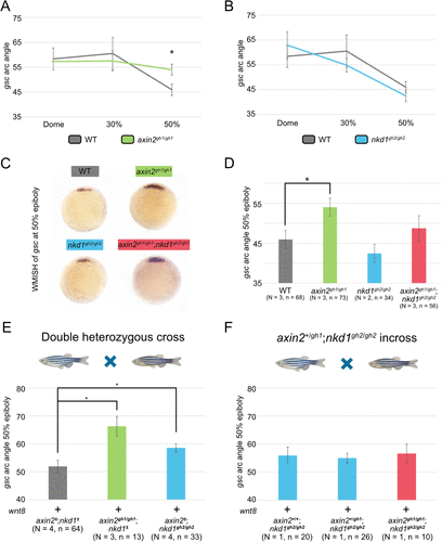 Fig. 5 Wnt regulator mutants have differential effects on gsc expression. (A–D) WMISH for gsc was performed on embryos at three different stages for axin2gh1/gh1 and nkd1gh2/gh2 single mutants (A and B) as well as 50% epiboly for all Wnt regulator mutants (C) and measured for the arc of gsc expression (D). At 50% epiboly, the arc angle of gsc expression was significantly broader in the axin2gh1/gh1 embryos, which was not seen in either nkd1gh2/gh2 or axin2gh1/gh1;nkd1gh2/gh2 mutants. (E and F) Analysis of gsc expression on embryos at 50% epiboly injected with 100 pg of wnt8 from either an axin2+/gh1;nkd1+/gh2 incross (E) or an axin2+/gh1;nkd1gh2/gh2 incross (F). (E) The axin2gh1/gh1;nkd1± and axin2±;nkd1gh2/gh2 embryos had an increase in gsc arc angle when compared with axin2±;nkd1± . (F) In contrast, axin2gh1/gh1;nkd1gh2/gh2 double mutant embryos showed no increase in gsc arc angle when compared with the single knockout genotypes. Injections were performed at the one cell stage and arc angle measurements were taken on ImageJ. Embryos were genotyped using indel detection by amplicon analysis and PCR based methods. A one-way ANOVA was used for all statistics with * = p value < 0.05, error bars represent SEM (A, B, C, and E) and SD (F).