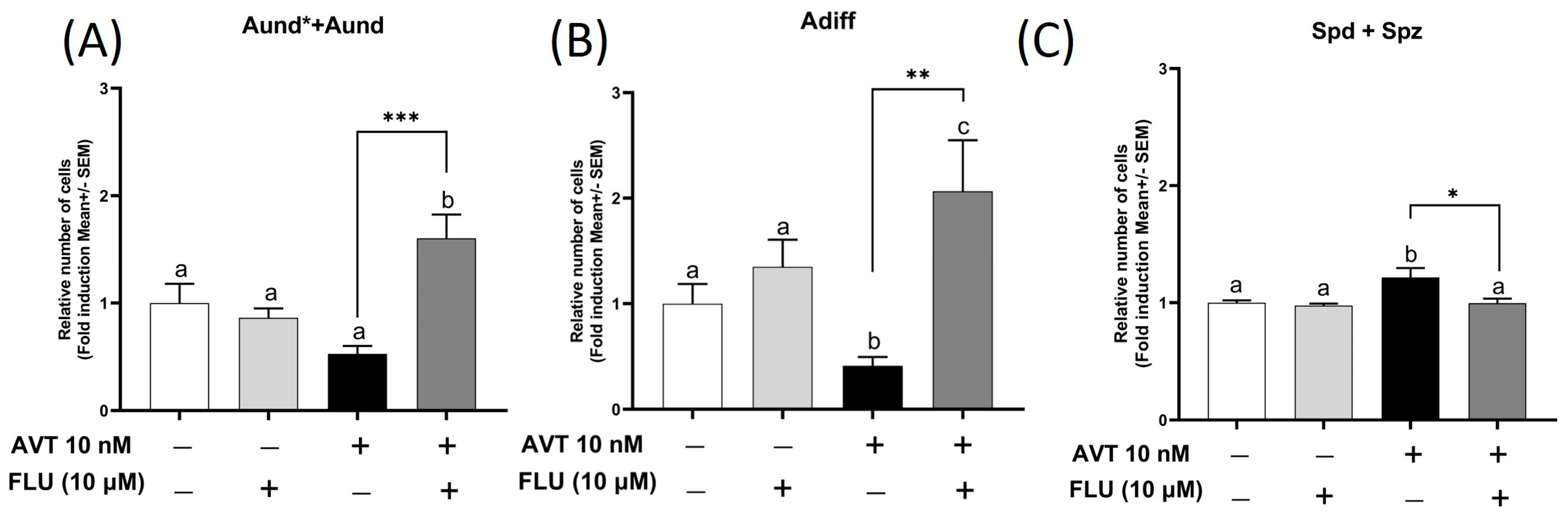 Fig. 5 The effect of 10 μM of flutamide (FLU), alone or in combination with 10 nM vasotocin (AVT), on (A) spermatogonia type Aund* + Aund, (B) Adiff, and (C) haploid spermatids and spermatozoa, following 7 days of ex vivo culture. Cells were counted in the control vs. treatment groups, and each treatment group was normalized against its control and expressed as fold change (mean ± SEM; n = 8–10). Values displaying different symbols are significantly different (one-way ANOVA followed by Tukey’s multiple comparison test, * p < 0.05, ** p < 0.01, *** p < 0.001).