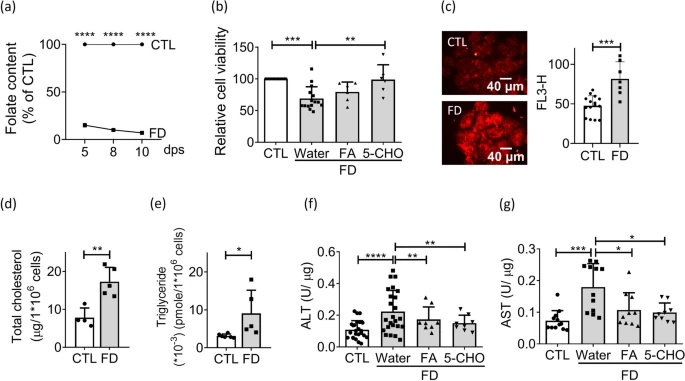 Fig. 3 Increased lipid deposition was found in FD Huh7 cells. Huh7 cells were cultivated in FD medium and examined for cell viability and lipid content. a Huh7 cells cultivated in CTL (0.004 g/L folic acid) or folate-deficient (FD) medium were analyzed with microbiology assay for folate content. A more than 90% depletion of intracellular folate content was established at 10 day-post-seeding (dps) for the cells growing in FD medium. Presented are data collected from 3 and 4 independent experiments at 5 dps, and 8 and 10 dps, respectively. b Huh7 cells were cultivated in CTL or FD medium for 7 days (dps) before adding FA or 5-CHO-THF for rescue. Cell viability was examined on 8 dps. The decreased cell viability due to FD was successfully rescued by the presence of FA or 5-CHO-THF. Data were collected from at least 6 independent experiments. c Cells were stained with Nile red and analyzed for lipid content with direct visual inspection with fluorescence microscopy (left) and quantified by flow cytometry (right). Scale bars = 40 µm. Data were collected from at least 7 independent experiments. d-e The cholesterol (d) and triglyceride (e) levels of Huh7 cells at 8 dps was measured with colorimetric/fluorometric Assay. Data were collected from at least 6 independent experiments. f-g Cells cultivated in FD medium with/without FA or 5-CHO-THF supplementation were examined for ALT (f) and AST (g) content. The increase of both ALT and AST was effectively alleviated by supplementing with FA or 5-CHO-THF. Presented are the averaged results of at least 8 independent trials. CTL, control (cells without FD); FD, folate deficiency. Statistical data are shown in mean ± SEM. * p<0.05, **, p <0.01; ***, p<0.001, ****, p<0.0001