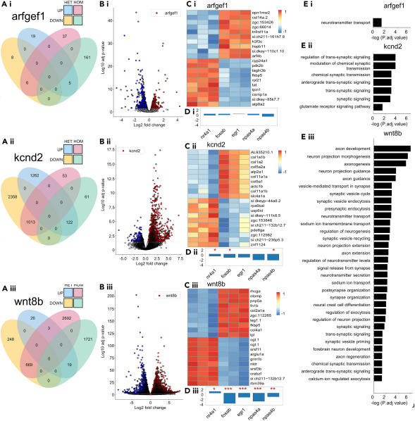 Fig. 4 Mutants show dysregulation and coincidence, among phenotypically similar mutants, of epilepsy associated genes and ontologies (A.i–A.iii) Venn diagram of the total number differentially expressed genes (DEGs) per mutant genotype. (B.i–B.iii) Volcano plot of HOM vs. WT DEG’s per mutant genotype. (C.i–C.iii) The top twenty most up and down regulated genes in homozygous mutants versus control. (D.i–D.iii) HOM vs. WT mutants effect size estimation of differential immediate-early gene transcription. padj < 0.05, ∗p < 0.05, ∗∗p < 0.01, ∗∗∗p < 0.001. (E.i–E.iii) Selective and possibly explanatory GO terms from HOM vs. WT DEGs. Additional information available in Figure S1 .