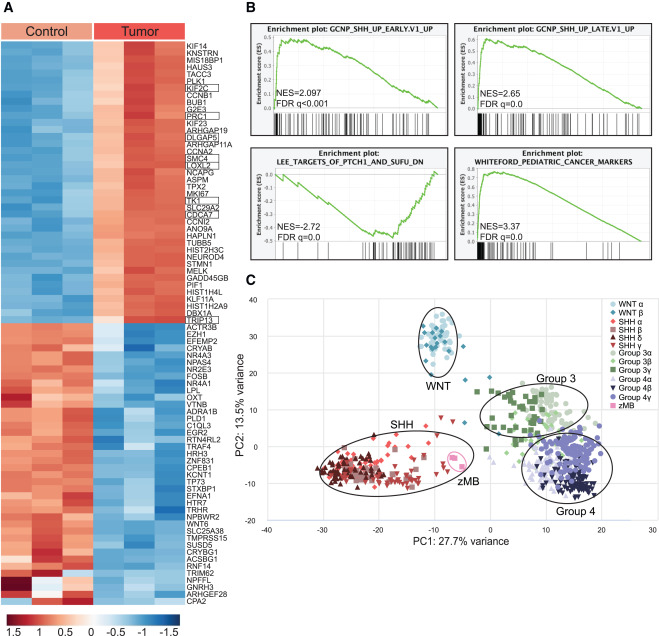 Fig. 4 Zebrafish ptch1-crispant brain tumors resemble human SHH medulloblastoma (A) Heatmap of the top 40 differentially regulated genes in tp53M214K control brain tissue (Control) and tp53M214K; ptch1 gRNA #1 brain-tumor tissue (Tumor). Three biological replicates were analyzed per group. Control animals were 52 wpf, and tumor animals were 4–7 wpf. Genes were filtered for those that had clear human homologs. SHH-pathway response genes are boxed.40 (B) GSEA was performed to identify expression pathways enriched in tp53M214K; ptch1-crispant brain-tumor tissue compared to tp53M214K control brain. NES, normalized enrichment score; FDR, false discovery rate. (C) Principal-component analysis (PCA) comparing zebrafish tp53M214K; ptch1-crispant brain tumors with human MB samples that previously defined four major MB subgroups: SHH, WNT, group 3, and group 4. The zebrafish tumors (pink boxes) cluster with the human SHH subgroup, as indicated. See also Figures S2–S5 and Table S2.