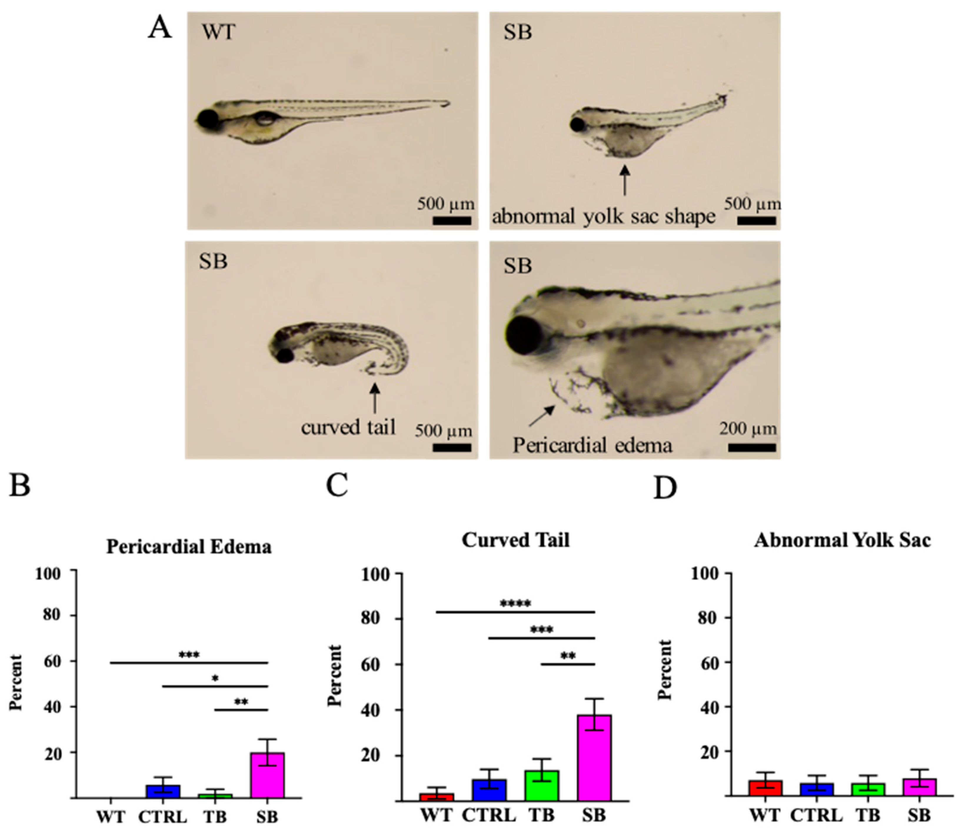 Fig. 3 Phenotypic assessment of CPT2 knockdown larvae. (A). CPT2 knockdown larvae at 5 dpi presented with several predominant phenotypic differences such as pericardial edema, curved tail, and abnormal yolk sac shape. Representative images of SB-injected phenotypes (SB) and wildtype (WT) comparison are shown. Scale bar = 500 µm and 200 µm, respectively. (B–D). Percent of qualitative phenotypic differences was compared between conditions. (A–D). WT = wildtype zebrafish; CTRL = control, scrambled MO-injected zebrafish; TB = translation blocking MO-injected zebrafish; SB = splice blocking MO-injected zebrafish. N = 50 fish per condition. * p ≤ 0.05, ** p ≤ 0.01, *** p ≤ 0.001, **** p ≤ 0.0001. Error bars = SEM.