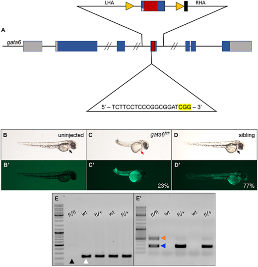 Fig. 5 Generation of a floxed gata6 zebrafish allele. (A) Schematic showing insertion of loxP sites flanking exon 4 of the gata6 locus on chromosome 2. The middle line represents the gene, with rectangles as exons, and blue indicates the coding sequence, with intronic sequences not shown between the forward slashes. Gray boxes represent non-coding exon sequences. Sequences encoding the C-terminal zinc-finger DNA-binding domain are indicated in red. The upper line represents the donor oligomer including both left (LHA) and right (RHA) homology arms. Yellow triangles represent loxP sites and the black box represents the barcode. The asterisk indicates a base change to block gRNA interaction with the donor sequence. On the lower line, text represents the guide sequence with the PAM site highlighted in yellow. (B-D′) Microscopy images of 2 dpf progeny from an in-cross of gata6fl/+ adults harboring the TgBAC(ubb:loxP-TagBFP-STOP-loxP-EGFP)vcc18 allele, after injection of Cre mRNA at the one-cell stage. (B,C,D) Bright-field images show normal development in uninjected (B) and sibling embryos (D, black arrows). Injection of Cre mRNA results in pericardial edema (red arrow) in the gata6fl/fl embryo (C). (B′,C′,D′) GFP fluorescence showing successful excision of the TgBAC(ubb:loxP-TagBFP-STOP-loxP-EGFP)vcc18 reporter (C′,D′) compared with GFP-negative uninjected controls (B′). (E,E′) Representative example of genotyping 2 dpf whole embryos after Cre mRNA injection. (E) PCR screening for gata6fl/fl embryos using the 7991/7992 primer pair showing the presence (white arrowhead) or absence (black arrowhead) of the band corresponding to the wild-type gata6 allele. (E′) PCR screening for gata6fl/fl excision using the 7786/7787 primer pair showing bands corresponding to excised floxed alleles (blue arrowhead). In this particular gata6fl/fl embryo, some residual unexcised genomic DNA remains (orange arrowhead).