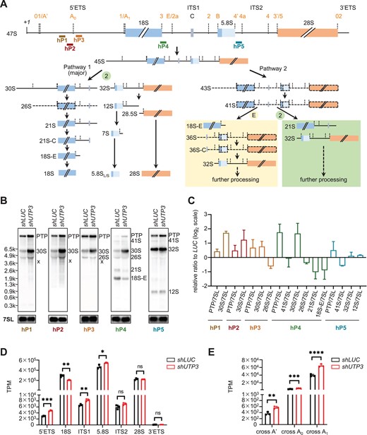 Fig. 9 Depletion of human UTP3 mainly impairs the 5′ETS processing at the A0-site. (A) Diagram showing the human rDNA genomic structure and positions of the five probes (hP1 to hP5) for Northern blot. Short-lived precursors are represented with dotted lines. (B) Comparison of the processed rRNA species in shLUC and shUTP3 cells by Northern blot using three 5′ETS (hP1, hP2, hP3) probes, one ITS1 (hP4) probe and one ITS2 (hP5) probe. The intermediate products of pre-rRNA processing in cells were highlighted according to (A). PTP: primary transcript plus, co-migrating 47S and 45S pre-rRNAs; x: aberrant band. (C) Ratio analysis of multiple precursors (RAMP) derived from three independent Northern blot experiments. Different colors of bars represent analyses derived from distinct probes as indicated. (D) Graph showing the statistical analysis of the TPM-based sequence reads derived from the total RNA-seq data for 5′ETS, 18S, ITS1, 5.8S, ITS2, 28S and 3′ETS in shLUC and shUTP3 cells. (E) Statistical analysis of reads encompassing A′, A0 and A1 cleavage sites in shLUC and shUTP3 cells.