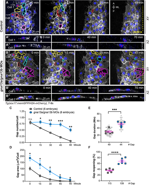 Fig. 3 Gα13 regulates stable cell-cell contacts and proper changes of endodermal cell shape during endoderm C&E. Confocal time-lapse experiments were conducted at the most lateral and anterior regions of pharyngeal endoderm in the indicated embryos during 7-9 ss. (A,B) Snapshots of confocal z projections in the xy view, taken at different time points from Movie 1, illustrating the morphology of endodermal cells at various time points. Gaps between endodermal cells are outlined, and the same gap over time is outlined by the same color. (A'-B″) Confocal images of xz planes of two representative cells (cell 1 and cell 2), captured at regions marked by white arrows in A and B, from Movie 2, illustrating the orientation of the nuclei of two cells at the indicated time-points. (C-F) The average number (C), area (D), duration (E) and reopening frequency (F) of the gaps in endodermal cells in the indicated embryos at different time points. (E) Data from all embryos (squares) and all xy images (gray circles) are superimposed. A, anterior; P, posterior; ML, mediolateral; D, dorsal; V, ventral. Yellow dashed line, midline. Data are mean±s.e.m. n.s. (not significant), P>0.05; *P<0.05; **P<0.01; ***P<0.001; ****P<0.0001 (unpaired, two-tailed Student's t-test).