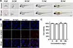 Fig. 2 The biological safety of XAL-NPMOF in zebrafish larvae and HUVECs. (A) Phenotypes of larvae after exposure to XAL-NPMOF. (B) Images of HUVECs incubated for 8 h with XAL-NPMOF. Note that the red spots are XAL-NPMOF. (C) Viability of HUVECs cultured with XAL-NPMOF. The dorsal region is up, and the rostral region is left in (A). Scale bar in (A): 500 μm; (B): 20 μm. Abbreviation: hpf, hours post fertilization