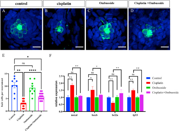 Fig. 6 Ombuoside protects zebrafish hair cells from cisplatin-induced damage. A–D. Tg(brn3c:GFP) Zebrafish larvae at 5 dpf were pre-exposed in ombuoside for 2 h, and then co-treated with 800 μmol/L cisplatin for 8 h. Confocal microscopy was used to detect the green fluorescent protein (GFP) expression of hair cells, N ≥ 8. E. Assessment of the number of hair cells per neuromast in Fig. .6A–D, N ≥ 8.F. Relative expression of apoptosis-associated mRNA in zebrafish treated with cisplatin alone or co-treated with ombuoside, N = 3. Data are presented as mean ± SEM. ∗P ≤ 0.05, ∗∗P ≤ 0.01, ∗∗∗P ≤ 0.001, and ∗∗∗∗P ≤ 0.0001. Scale bar: 10 μm.