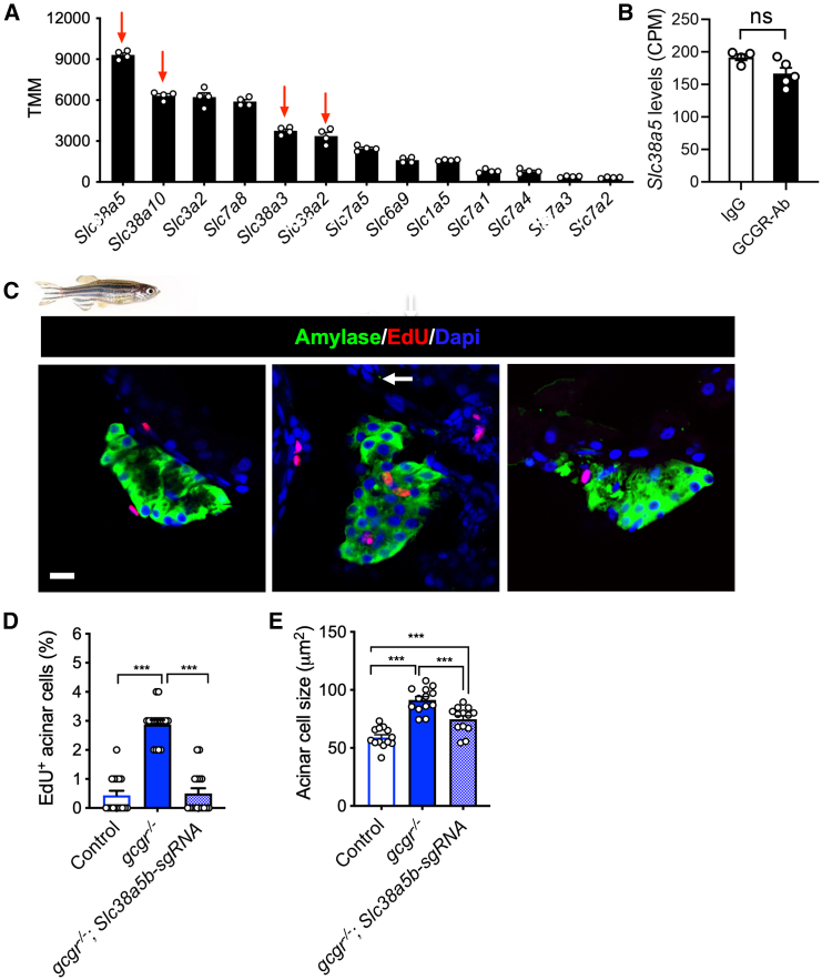 (B) Slc38a5 expression in acinar cells of IgG and GCGR-Ab treated mice. CPM, count per million. Student’s t test.