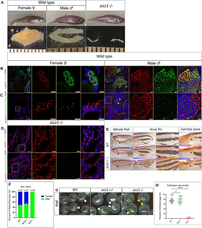 A. Representative adult fish at 3 months post-fertilization and their corresponding gonads of the indicated genotypes. Ruler grades are 1mm, showing similar standard lengths (SL) of fish from all genotypes (S3A Fig), but much smaller gonads of asz1-/- compared to wt ovaries and testes. B-C. Representative confocal images of wt ovaries and testes, labeled with Ddx4 (green), mAb414 (red) and DAPI (blue) in B, and with Acetylated tubulin (green), β-Catenin (red) and DAPI (blue) in C. Insets show single and merge channels of magnifications of the yellow boxes in zoomed out images. Scale bars are 50 μm and 10 μm in zoomed out and inset magnification images, respectively. In C, yellow arrowheads indicate zygotene cilia in spermatocytes, and white arrowheads indicate flagella of mature sperm. For each B and C labeling, n = 12 ovaries and 12 testes. D.asz1-/- gonads labeled for, top: Ddx4 (green), mAb414 (red) and DAPI (blue), bottom: Acetylated tubulin (green), β-Catenin (red) and DAPI (blue), as in B-C. n = 6 gonads. E. Dimorphic external sex criteria in wt, and their phenotypes in asz1-/- fish. Left panels show larger abdomen in females (arrowheads). Middle panels show the anal fin (right images are zoomed-in magnifications), with more pigmented stripes (white bracket) in the male. Right panels show the larger genital pore in the female (arrowheads). asz1-/- fish exhibit typical male anatomy of all criteria. The number of analyzed fish is indicated in the plot in F. F. A plot showing the representative sex ratios in each genotype from two independent clutches as determined by the external sex criteria in E. n = number of fish. Bars are mean ± SD. G. Progeny embryos of crosses between wt females and either wt, asz1+/-, or asz1-/- males as indicated, at 4 hpf. Fertilized embryos exhibit an opaque animal pole which results from cellularization during cleavage stages (white arrowheads), while unfertilized eggs exhibit a transparent acellularized animal pole (yellow arrowheads). H. Dot plots showing the fertilization rates per mating from the crosses in G. n = number of cross pairs. Bars are mean ± SD.