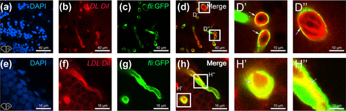 Fig. 7 LDL are taken up by cerebral endothelial cells. (a–h″) intraperitoneal injection of Dil-labelled LDL in Tg(fli1:EGFP) fish (green) allowing to show the vascular distribution of LDLs (in red) in the telencephalon. White squares in d and h identify the high magnifications provided in D′, D″, H′ and H″. The arrows indicate the colocalization of GFP (green) and stained LDL (red), demonstrating that a subset of plasma LDL are taken up by endothelial cells (yellow colour). Bar: 40 μm (a–d), 16 μm (e–h). 10 μm (D′, D″, H′ and H″).
