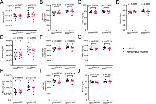 Fig. 4 Loss of cped1 does not affect vertebral bone mass and morphology in multiple mutant lines. (A-J) Combined analysis of vertebral measurements for cped1sa20221 and cped1w1003 mutants compared to their respective wildtype clutchmates. Each point represents a single fish, and the value is the average of 16 measured vertebrae. Bars indicate mean ± SEM. Shown are p-values from Sidak’s multiple comparisons tests; no significant p-values for comparisons between homozygous mutants and respective controls were observed.