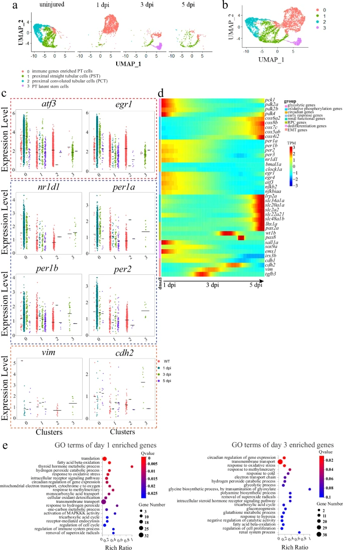 Fig. 2 Dynamic gene expression of the 4 PT subclusters during renal regeneration.a UMAP embedding of scRNA-seq data colored by time points highlights the progressive nature of 4 subclusters during regeneration. b UMAP embedding of all cells profiled during early stages of renal regeneration. c Violin plots showing dynamic expression of the indicated genes, grouped into markers of early response, RPCs, circadian clock and EMT. The colored boxes were used to highlight the indicated groups. 0–3 of the X-axis: the subclusters 0–3. d Heat map showing the dynamic expression of the indicated genes, grouped into 8 categories that are shown on the upper right corner. e GO terms of the enriched genes at 1 and 3 dpi.