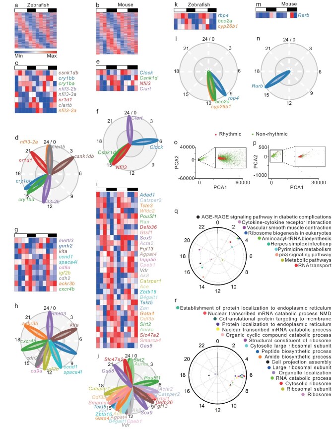 Rhythmic testicular transcriptome in zebrafish and mice. (a and b) Heatmaps of the 1082 zebrafish rhythmic transcripts (a) and 1882 mouse rhythmic transcripts (b), revealed by the MetaCycle analysis of the 12-timepoint transcriptome data (