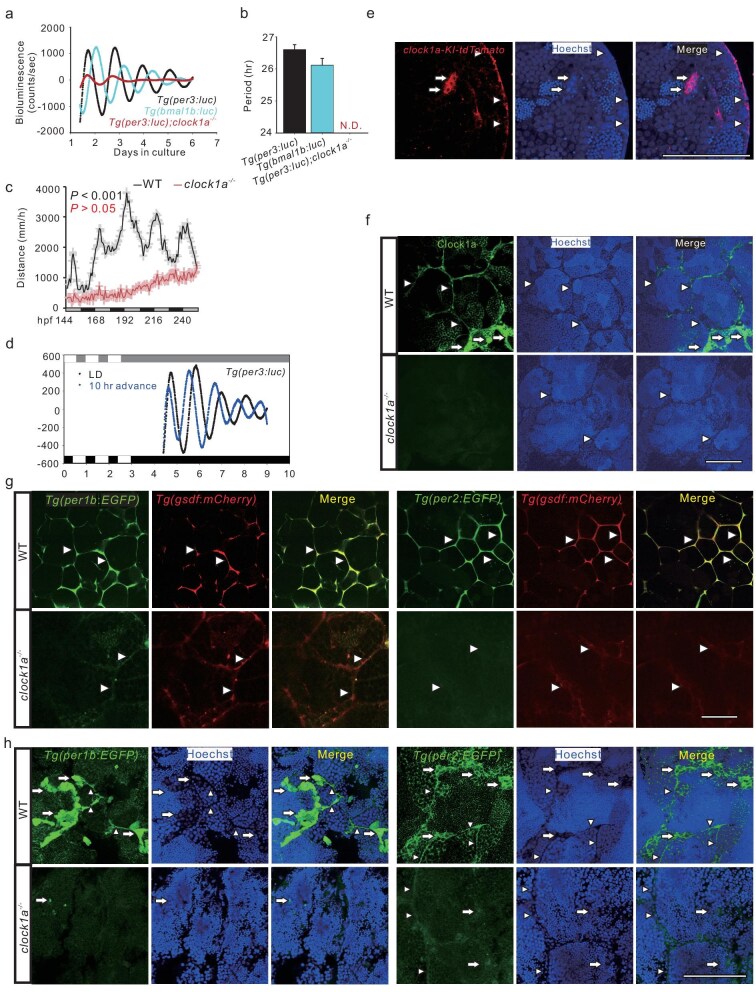 The zebrafish testis clock ticks in a cell-specific manner. (a and b) Bioluminescence recordings (a) and their periods (b) of the testis cultured
