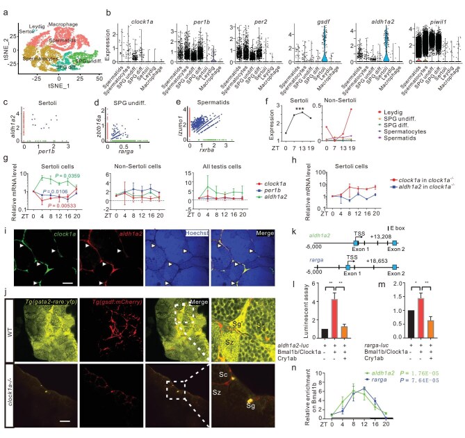Circadian regulation of RA signaling in zebrafish. (a) scRNA-seq analysis identifies seven zebrafish testicular clusters (