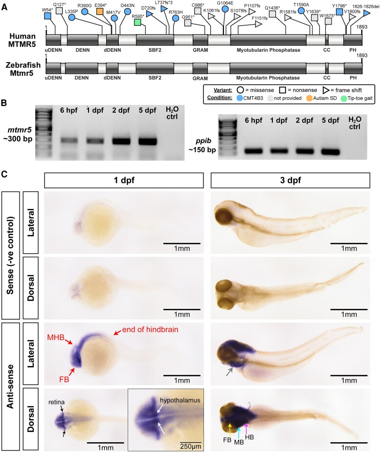 MTMR5 domain topology, pathogenic variants, and spatiotemporal expression pattern in zebrafish. (A) Human MTMR5 contains six functional domains: an N-terminal tripartite DENN domain [upstream DENN (a.a. 1–86), DENN (a.a. 129–311) and downstream DENN (a.a. 364–433)], an SBF2 domain (a.a. 543–765), a GRAM domain (a.a. 883–969), a catalytically inactive myotubularin-phosphatase domain (a.a. 1108–1533), a coiled-coil domain (CC, a.a. 1651–1665) and a C-terminal PH domain (a.a. 1763–1868). Of note, the domain topology of the MTMR5 protein is highly conserved between human and zebrafish. Pathogenic variants are found throughout the gene (for details, see Supplementary Table 1). Note: autism SD (spectrum disorders). (B) RT-PCR using total cDNA shows temporal expression pattern of zebrafish mtmr5 from 6 h post-fertilization (hpf) to 5 dpf (days post-fertilization). Note: ppib is a housekeeping control. (C) Whole-mount in situ hybridization using DIG-conjugated RNA probes in 1 dpf and 3 dpf embryos. The sense probe (negative or −ve control) gives no staining at 1 dpf or 3 dpf. At 1 dpf, from the lateral view, the anti-sense probe shows ubiquitous staining in the brain, including the forebrain (FB), midbrain-hindbrain boundary (MHB), and the hindbrain; the dorsal view at 1 dpf also revealed staining in fine structures such as the retina and the hypothalamus (inset scale bar 250 μm). Similar brain-specific staining can be observed at 3 dpf for the anti-sense probe, in the forebrain (FB), midbrain (MB) and hindbrain (HB). Staining is also visible in the jaw region at 3 dpf (lateral view, arrow). Scale bars: 1 mm. Domain topology of MTMR5 proteins was mapped using SMART18 and DeepCoil.19 Domain illustrations were generated using IBS 2.0.20 Uncropped gels of Fig. 1B are included in Supplementary Fig. 5A.