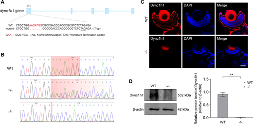 Fig. 1 Identification of dync1h1 knockout zebrafish. (A) Schematic representation of the genomic region and exon/intron structure of dync1h1 in zebrafish. Knockout of dync1h1 results in a truncated protein, with deletion located in exon 1. (B) Direct sequencing comparison of WT, dync1h1+/−, and dync1h1−/− zebrafish lines. (C) Immunofluorescence staining showing dync1h1 protein expression in 5 dpf WT and dync1h1−/− zebrafish. Nuclei are stained with DAPI. (D) Western blot analysis of dync1h1 protein expression in 5 dpf WT and dync1h1−/− zebrafish, with β-actin as the endogenous control. +/−, dync1h1 heterozygote; −/−, dync1h1 homozygote. Scale bar = 50 µm. Data are shown as mean ± SD. **, P < 0.01, n = 3 biologically independent samples per group. DAPI, 4′,6-diamidino-2-phenylin-dole; dpf, days post fertilization; SD, standard deviation; WT, wild type.